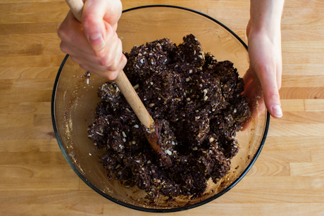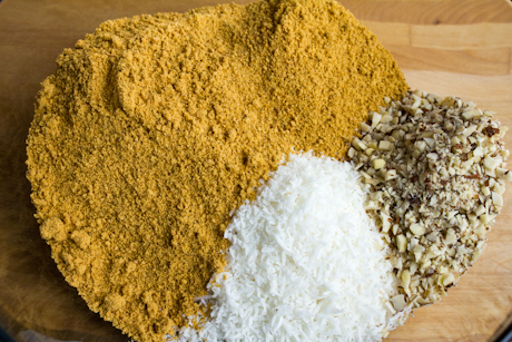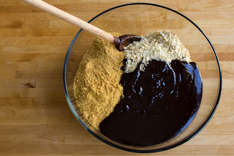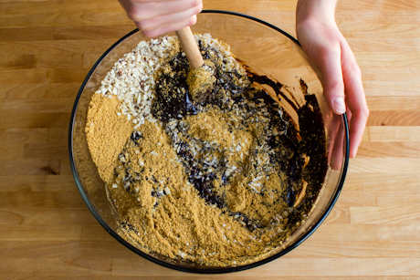 In a large bowl, combine graham crumbs, coconut, and almonds. Transfer the cocoa mixture into the dry ingredients. Mix thoroughly until all the ingredients are well combined.