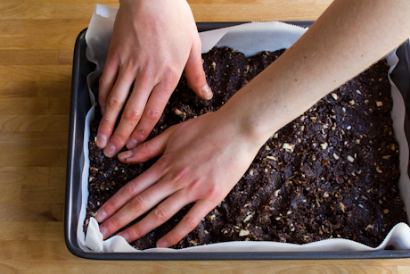 Press evenly and firmly into the prepared pan. Place in the freezer or refrigerator until the base is set, 15 – 30 minutes.