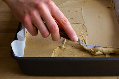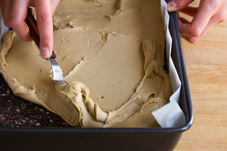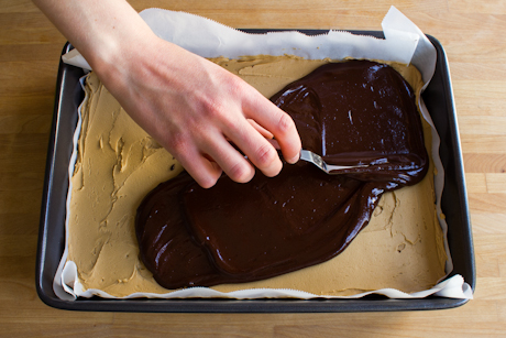 Pour over the filling and spread evenly with an offset spatula or knife. Tap pan onto work surface to even out chocolate topping and to remove any air bubbles.
