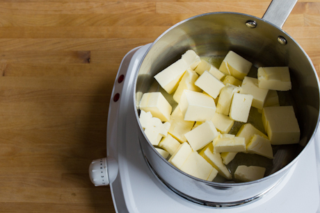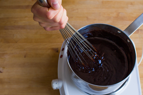 In a small pan over low heat, melt the chocolate, butter, and espresso powder, stirring frequently until smooth. Or, to prevent potential scorching of the chocolate, place the chopped chocolate, butter, and espresso powder into a heatproof bowl fitted over a small pot of just simmering water and stir until just melted. Remove from heat and stir until smooth and chocolate has slightly cooled or at room temperature.
