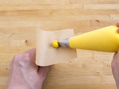 2. Divide remaining frosting between 3 bowls. Leave one bowl of frosting white and tint the other bowls with your colour of choice (we chose light and golden yellow).