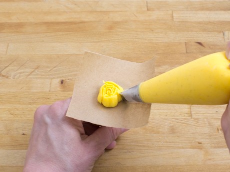 5. Fit a second piping bag with the small petal tip, filling with tinted frosting. Place a small dollop of frosting on the flower nail and press on a parchment square. Hold the bag with the large end of the tip touching the centre of the paper. Squeeze the bag, while slowly turning the nail, to create a small rosette. Release and begin piping ribbon shaped petals around the rosette, overlapping each petal. Repeat to make about eight flowers one to two inches (2.5 to 5 centimetres) in diameter.