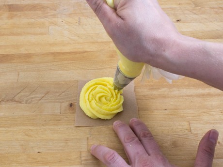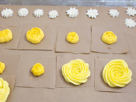 6. Fit the third piping bag with the medium closed star tip and with the second tinted frosting. Hold the piping tip about ½ inch (1.3 centimetres) above the a square of parchment. Squeeze bag slowly and, pressing lightly, pipe in an outward spiral. Ease the pressure on the bag and then gently press down and pull up to release. Repeat to make five flowers two to three inches (5 to 7.5 centimetres) in diameter. Freeze flowers for at least 20 minutes.