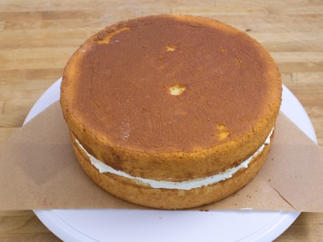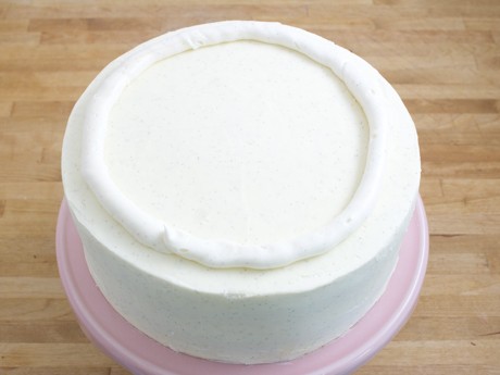 1. Using a sharp, serrated knife, trim off the domed top of each cake. Place one cake, cut side up, on a cake turntable or level surface.