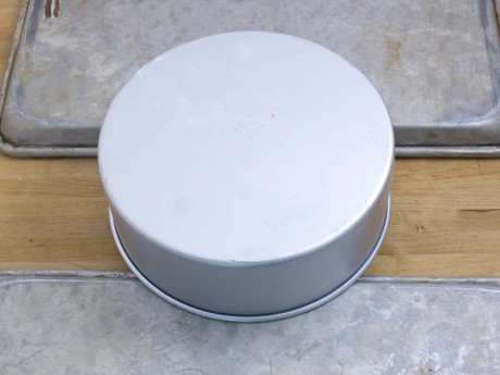 8. While cakes are baking invert 2 sheet pans on the counter, spacing them about 6 inches (15 centimetres) apart. Suspend cakes upside down between the two inverted sheet pans and allow to cool for 20 minutes.