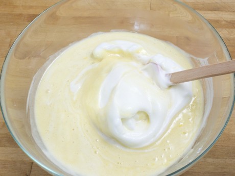 4. With electric mixer on medium, beat together the egg yolks, oil, buttermilk, lemon zest, lemon juice and lemon extract until smooth.