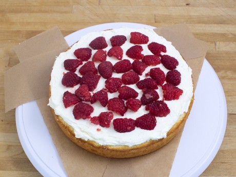 2. Place about ¾ cup (165 grams) of frosting on the cake, spreading evenly with an offset spatula and pressing in raspberries. Spread ¼ cup (55 grams) of frosting over the berries to create an even layer. Top with second cake, cut side down, and press gently.