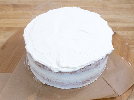 3. Using an offset spatula, spread a thin layer of frosting over the top and sides of the cake to seal in the crumbs. Chill in refrigerator for 15 minutes.