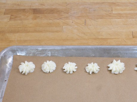 3. Fit a piping bag with the small closed star tip and fill with white frosting. Hold piping bag perpendicular to the parchment lined sheet, ½ inch (1.3 centimetres) from the paper. Squeeze piping bag to create a blossom, then release pressure, press down and pull up. Repeat to make 12 flowers about 1 inch (2.5 centimetres) in diameter.