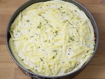 Beginning with the third crêpe, repeat layers until all crêpes are used. Sprinkle the reserved ½ cup (46 grams) of cheese and thyme leaves overtop.