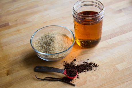 4. Mix the cooled syrup and rum into the coffee mixture, seal the container and transfer to the fridge. Let the mixture rest for 3 days. Remove the vanilla bean from the mixture and bottle your liqueur.