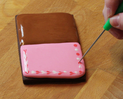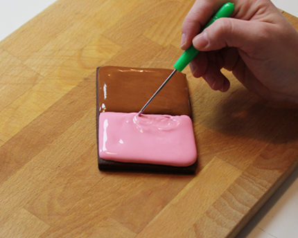- Cover half a cookie with brown filler icing and the other half with pink filler icing. Even top with a pastry needle.