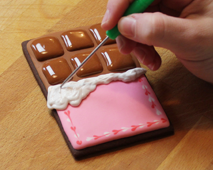 - Complete by drawing the wrapper with white detailing icing. Let dry completely before handling the cookies.