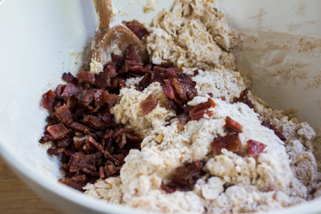 3.Stir in the buttermilk and vanilla extract. Fold in the crumbled bacon. Do not over mix.