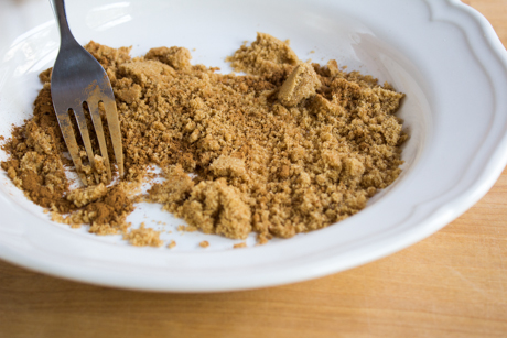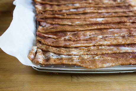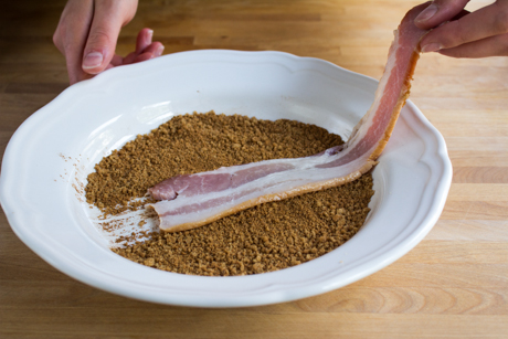 3. Combine cinnamon and brown sugar and spread out on a large plate. Pull bacon slices through the cinnamon sugar until well coated.