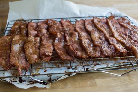 4. Lay the bacon strips on the wire rack. Transfer the baking sheet to the oven and bake for 30 – 45 minutes, flipping the bacon once. Drain on paper towel for 1 minute.