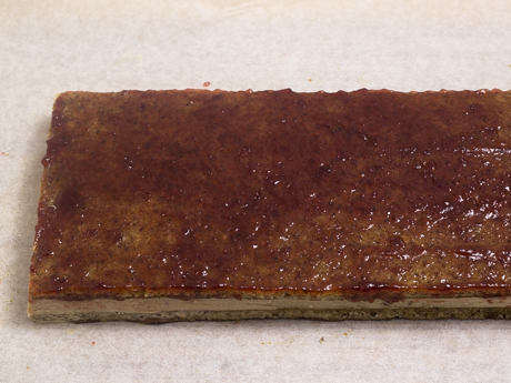 6. Spread second cake layer with chilled ganache and ¼ cup (77 g) sour cherry jam; top with last rectangle of cake and brush with syrup.