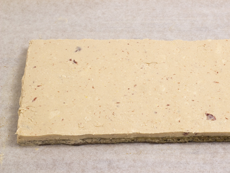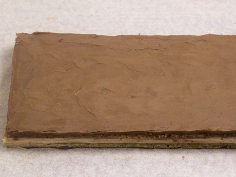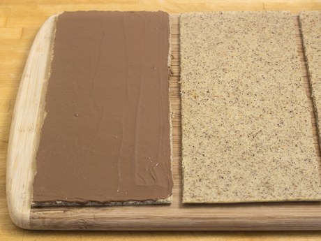 1. Cut the hazelnut sponge into 3 rectangles 5 1/2 x 11 inches (14 x 28 centimetres).