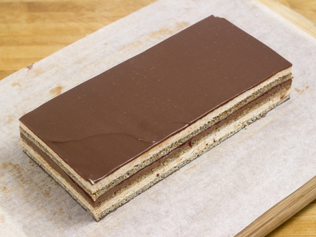 11. To serve, use a warm, clean knife to slice pieces about ¾ inch (1.5 centimetres) thick. Opera Cake will keep for up to 4 days in an airtight container in the refrigerator. Allow to sit at room temperature for 20 minutes before serving.