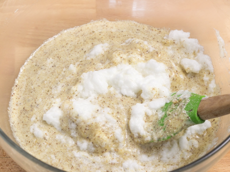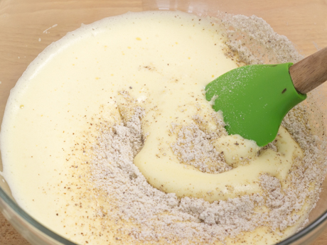 5. Sift the hazelnut mixture over the eggs in two additions, and gently fold in each addition using a rubber spatula. Fold the whites into the whole egg mixture in two additions. Pour the cooled melted butter down the side of the bowl; fold in.