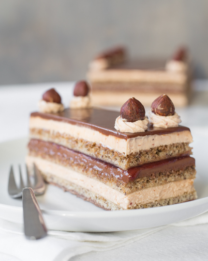 *Though there are multiple components of the Opera Cake, most of them can be prepared in advance. The hazelnut sponge cake, coffee syrup and sour cherry buttercream can all be frozen in airtight containers for up to one month. Before assembling, allow to defrost in the refrigerator overnight. The milk chocolate ganache and glaze are best made the day of assembly.