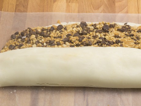 6. Spread dough with the peanut butter, leaving 1 inch (2.5 cm) of a long side uncovered; sprinkle peanut butter with peanuts, chocolate chips and salt. Moisten the uncovered 1 inch (2.5 cm) of dough with a bit of water and starting on the opposite end, begin rolling up the dough into a spiral. Press moistened end of dough firmly to seal and wrap spiral tightly in plastic wrap; chill for 1 hour.