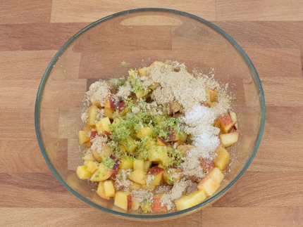 *If peaches are slightly under ripe, make a simple syrup by increasing the amount of the Redpath® Golden Sugar to 1/3 cup (72 g) and 1/3 cup (80 ml) water. Place into a medium pot. Add in 2 strips of (versus finely grated) lime zest and the lime juice. Bring mixture to a boil and stir to dissolve the sugar, lower to a simmer. Place halved and pitted peaches into the simmering liquid; poach 10 to 15 minutes. Remove pot from heat. Allow peaches to cool in the syrup. Cut cooled peaches into slices or cubes. Remove skins if desired, although not necessary.