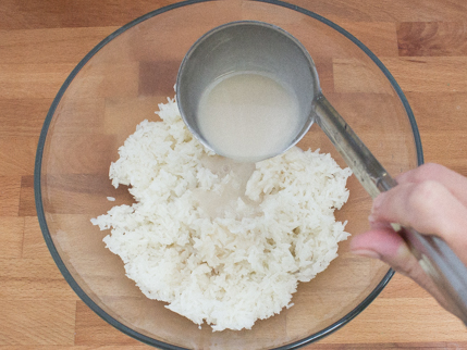 Ladle about half of the hot coconut milk over the rice. With a large spoon or rice paddle, gently stir the milk into the rice until absorbed. Pour the remaining milk over the rice and stir. Cover the rice with plastic wrap and allow the rice to stand at room temperature for about 30 to 45 minutes or until the coconut milk is absorbed by the rice.