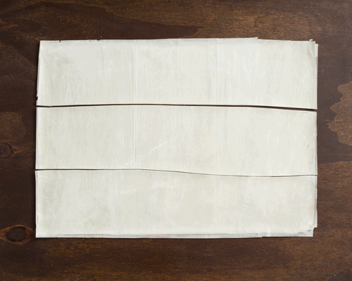 Working with one sheet of phyllo pastry at a time, keeping the rest covered, brush with melted butter. Place another sheet directly on top, brush with butter and top with a third phyllo sheet. Using a sharp knife slice layered pastry into 12 even squares.