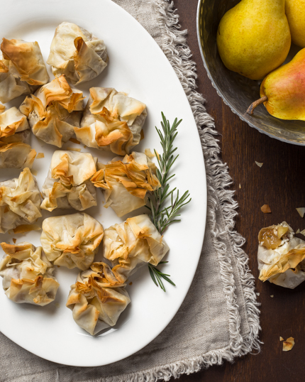 Place 1 heaping tbsp (20 g) of pear filling in the center of each pastry square, and top with ½ tsp (4 g) of goat cheese. Lightly brush the edges of each cut square with butter, bring corners together and pinch in the center to seal and form a parcel. Place on prepared baking sheet.