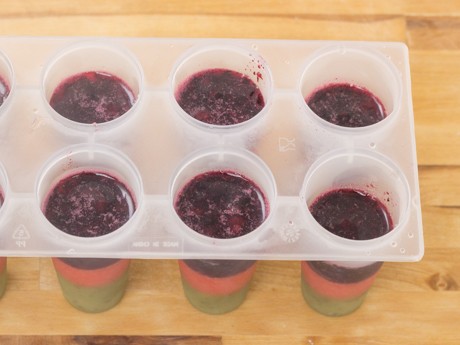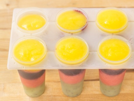 3. Carefully spoon a layer of fruit at the bottom of each mold. Firmly tap the mold on a counter to level the purée. Freeze until solid.