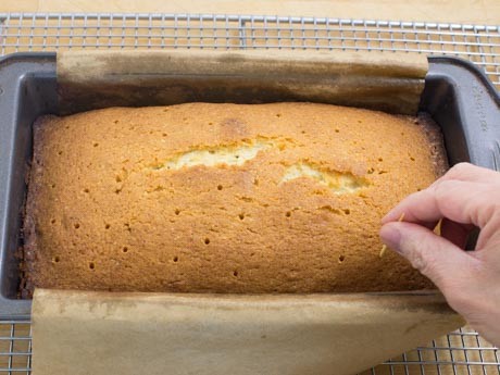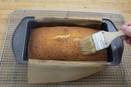 3. With a skewer, poke holes over the entire surface of the warm cake, piercing at least halfway through the loaf. With a pastry brush, evenly brush the surface of the cake with the rosewater simple syrup, until all of it is used.