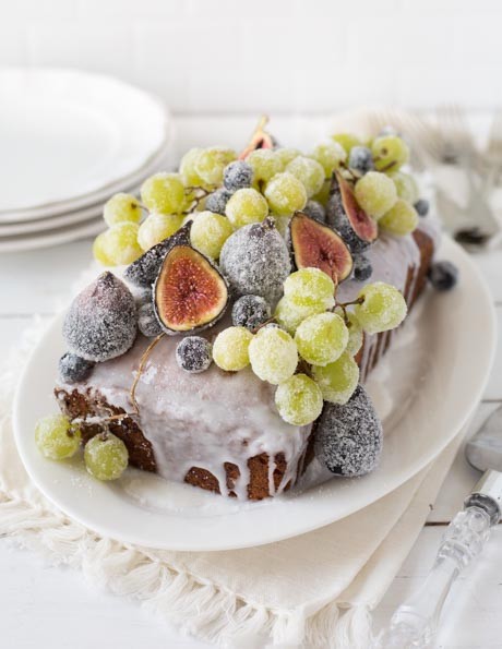 1. Place cake onto the desired serving platter. Pour and smooth icing over the top of the loaf cake. Allow the icing to slightly set; about 10 minutes. Arrange frosted berries and fruit on the top of the frosted cake. This cake pairs well with a cup of oolong or fruity black tea.