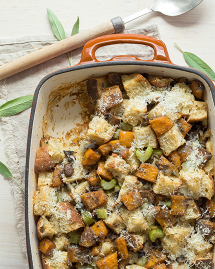 Transfer mushrooms to the bowl with the onion mixture. Add the cooled pumpkin, bread cubes and one cup (62 grams) of parmesan cheese. Toss well to combine and transfer to the prepared baking dish.