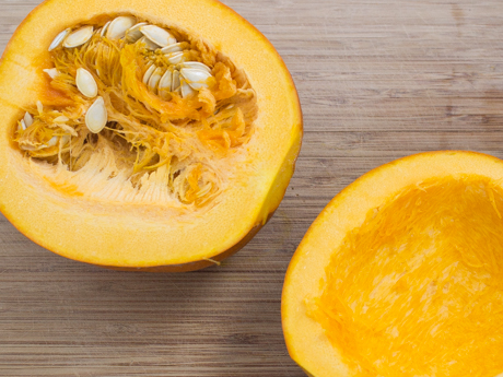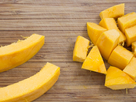 Cut pumpkin in half and scoop out seeds and stringy flesh. Carefully peel each half and cut into ¾ inch (2 centimetre) cubes.