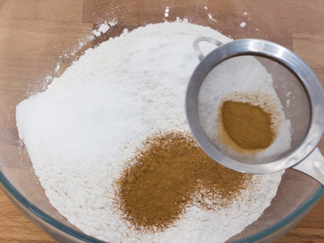 - Place flour in a large bowl and sift in the cinnamon, cream of tartar, baking soda, salt and baking powder. Whisk well to combine and sift the entire mixture once more.
