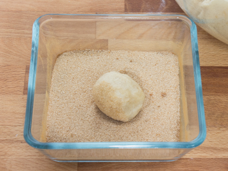 - Scoop 2 tablespoons (45 grams) of dough and roll into a ball. Drop into the cinnamon sugar and turn to coat. Place on the prepared baking sheets 3 inches (7.5 centimetres).
