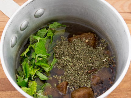 In a medium sauce pan combine the Redpath® Dark Brown Sugar, water, fresh mint, dried mint and cloves. Set over medium heat and bring to a simmer for 5 minutes. Set aside and allow to steep for 30 minutes.