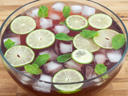 In a large punch bowl with a capacity of at least 4 litres, stir together the cooled syrup, cranberry juice, white rum, Aperol and lime juice. Chill if not serving immediately.