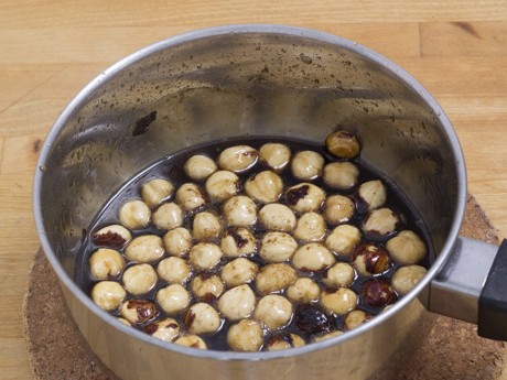 4. In a small saucepan, combine the Redpath® Dark Brown Sugar and water, and set over medium heat. Stir until mixture just begins to boil and the sugar is dissolved. Reduce heat to medium-low and simmer for 3 minutes, the mixture will thicken slightly. While the mixture is still on the heat, add the skinned hazelnuts and swirl around to coat the hazelnuts with the thickened simple syrup. Remove from heat and pour the contents back onto the parchment lined baking sheet. Place back into the oven to toast; about 10 minutes.