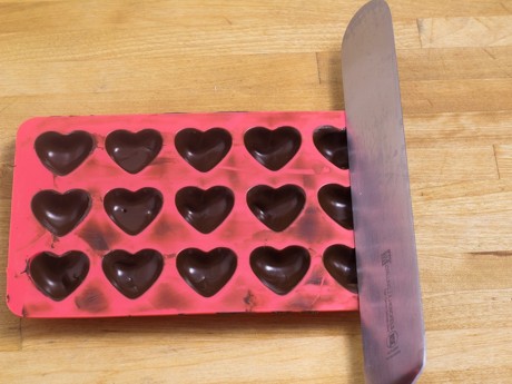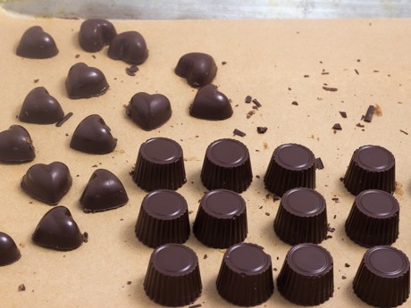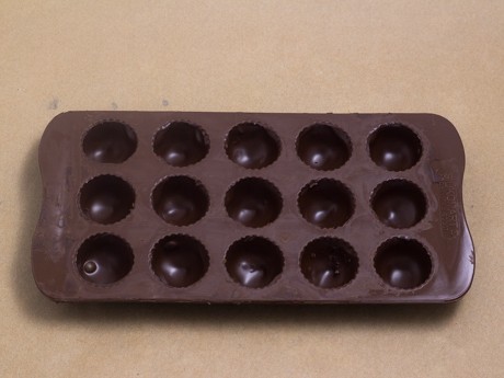 4. Allow the chocolates to harden (cavity side up) in a cool location or quickly place them into the fridge to set; about 3 to 5 minutes (set a timer to ensure that they do not stay in the fridge for too long as this will encourage the chocolates to untemper). Chocolates are ready to come out of the molds when they start to slightly pull away from the mold itself. Turn the molds over onto a piece of parchment paper, and they should easily fall out if they have completely hardened. Gently ease them out, if required, by tapping the bottom of each chocolate.