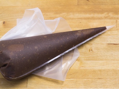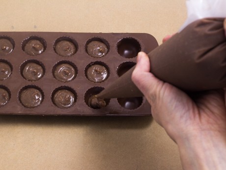 3. Once shells have hardened, cut off a tiny portion of the piping bag and pipe the cavities ¾ full with the hazelnut mixture. Make sure not to overfill or get any of the filling on the edges of the chocolates, as it will make it difficult to seal the molds. Allow the filling to set before spooning more chocolate over the filled molds. With a large off-set or straight spatula, scrape and smooth off the bottoms of the chocolates, making sure the edges around each cavity is clean.