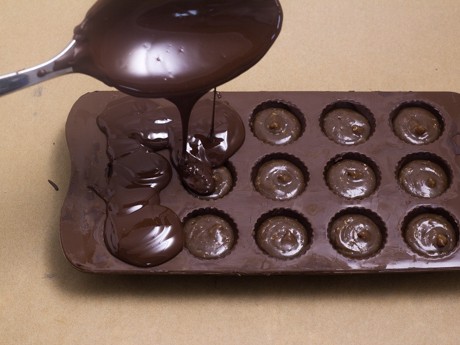 2. Fill chocolate molds with tempered dark chocolate. Once all molds are filled, tap mold onto work surface to release air bubbles. Turn the mold over and tap off the excess chocolate back into the bowl of tempered chocolate. Flip the mold over, and place it onto a cool baking sheet (or flat work surface). Tap the mold to release any air bubbles. With a small spatula, clean off any excess chocolate around the cavities of the molds to ensure a clean-finished product. Allow shells to harden in a cool location. To quickly harden shells, place onto a baking sheet and into the fridge for no longer than 5 minutes (set a timer), take out and allow to finish hardening in a cool location.