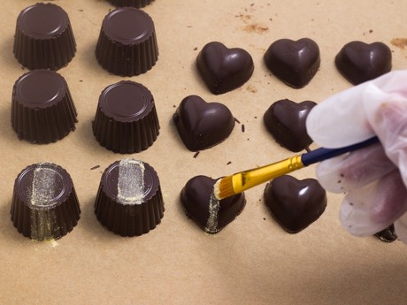 1. Dip a small, clean paint brush into desired shade of lustre dust. Brush the tops or sides of each chocolate. Feel free to brush on a single stroke or a design onto each chocolate. Alternatively, sprinkle a small amount of ground cayenne on the tops for extra heat and colour. Store in an airtight container in a cool, dry location.
