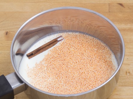 6. Place heavy cream into a small saucepan, add ground cayenne and cinnamon stick. Set on medium heat, and heat the cream until it just begins to simmer. Turn heat off and cover the pot with plastic wrap. Allow cinnamon to infuse into the cream; about 15 minutes.
