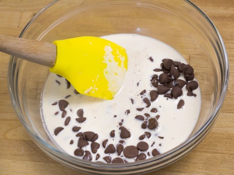 7. Discard the cinnamon stick and re-heat cream until it just begins to simmer. Remove from heat and stir in the vanilla extract. Place milk chocolate chips into a heat-proof bowl and pour half of the cream over the chocolate; allow to sit for about 1 minute. Using a rubber spatula, stir cream into the chocolate starting from the centre outwards. Once fully stirred in, pour in the remainder of the cream and stir until fully incorporated.