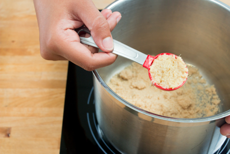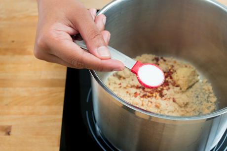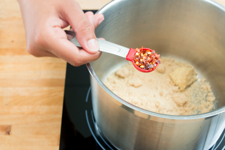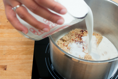 1. In a medium sauce pan combine the Redpath® Golden Yellow Sugar, ginger, chili flakes, salt and coconut milk. Over medium heat begin stirring the mixture. You want to just bring it to a simmer, stirring until the sugar is dissolved.