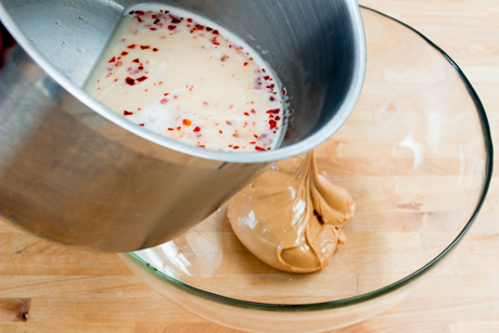 3. Once the sugar is dissolved into the coconut milk remove it from the heat then carefully pour it into the bowl with the peanut butter. Allow the mixture to rest for 2 minutes.