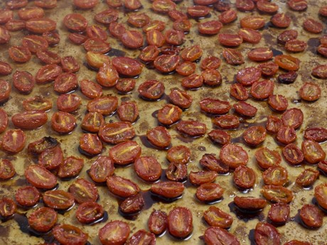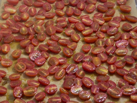 Spread the sliced tomatoes, skin side down, onto a prepared baking sheet.