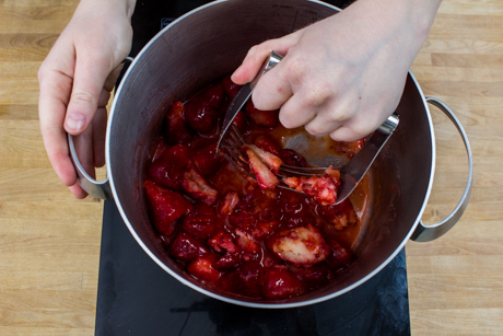 In a large pot, combine fruit, pectin, and lemon juice. Crush fruit using potato masher or pastry cutter.